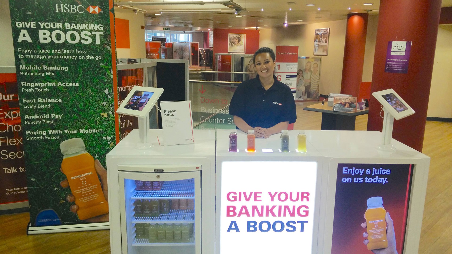 Working alongside Service Graphics, we provided a core event manager and local brand ambassadors to support a retail activation for HSBC, visiting branches throughout the UK. Our team was responsible for setting up an instore promotional stand from which they promoted the HSBC banking app, whilst engaging with customers and distributing free juice bottles.